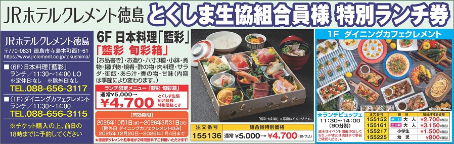 Life JRホテルクレメント徳島 特別ランチ券 6F 日本料理「藍彩」「藍彩 旬彩箱」組合員特別価格:通常¥5,000 ¥4,700(税込) 【お品書き】・お造り・八寸3種・小鉢・煮物・揚物・焼肴・酢の物・肉料理・サラダ・御飯・あら汁・香の物・甘味(内容は季節により変わります)<ご予約>6F 日本料理「藍彩」 088-656-3117※2025年11月11日(火)は、特別賞味会のため「旬彩箱」のご予約はできません。ご了承下さい。 1Fダイニングカフェクレメント🍽★ランチビュッフェ 11:30~14:00(90分制)組合員特別価格:平日 大人 ¥2,700(税込) :土日祝 ¥3,150(税込) ※小学生・幼児は、平日・土日祝共通 :小学生 ¥1,500(税込) :幼児 ¥ 800(税込) 注)ランチ券につきまして注文書にて購入される場合は、大人・小学生・幼児と、それぞれに注文番号を設定しております。お求め間違いのないようにお願いいたします。 有効期限※2025年10月1日(水)~2026年3月31日(火)【除外日】ダイニングカフェクレメントのみ 2025年12月20日~2026年1月4日まで※チケット購入の上、前日の18時までに予約してください。 <ご予約> ダイニングカフェクレメントは 088-656-3115 ★徳島駅クレメント駐車場が2時間無料でご利用頂けます! 画像をクリックで、ホテルクレメント徳島のホームページへ チケットのお申し込み チケットのお申し込みに関しては、下記の専用ダイヤルにお電話ください。 088-698-0506 < 一覧へ戻る > 関連商品 アオアヲナルトリゾートランチ券 郷土料理バイキングお昼の阿波三昧&温泉 日帰りプラン NEWレオマワールド 入園券 22種のアトラクション、グルメにショッピング、1日では遊びきれない楽しさいっぱい! 淡路島海上ホテル 日帰り・宿泊プラン 春の訪れを目と舌とで同時に楽しむ"桜鯛"たっぷりと栄養を蓄えた絶品の桜鯛をご堪能ください。 JRホテルクレメント徳島 特別ランチ券 日本料理“藍彩”「藍彩遊山箱」組合員特別価格:3,000円(税・サービス料込) おもちゃ王国入園券 子どものワクワクするものをなんでも集めた「おもちゃ王国」でぜひお楽しみください♪ 竹野の海辺 湯やど 海の音~うみのね~ 兵庫県の名湯【城崎温泉】まで車で15分。温泉街をぶらり満喫した後は、さざ波の音に包まれる当館で癒しの一夜をお過ごしください。 鷲羽山ハイランド入園券 蒼い海と照りつける太陽の中に、響きわたるサンバのリズム♪ カテゴリ ALL 暮らす 遊ぶ 学ぶ PC/ネット 冠婚葬祭 車関連 ペット その他
