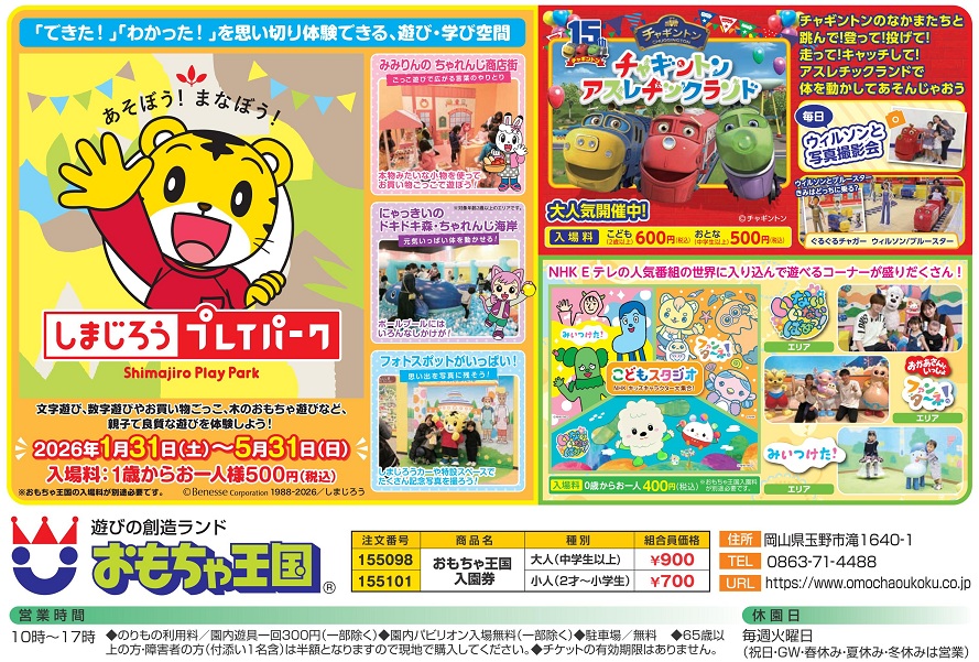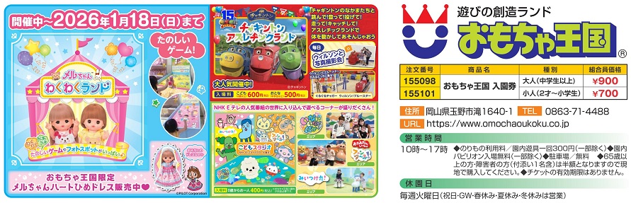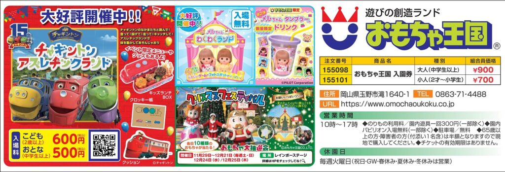 Life おもちゃ王国入園券 入園券(税込価格) 生協組合員特別価格 大人(中学生以上) :900円(通常1,000円) 小人(2歳~小学生):700円(通常800円)ご来園の際は、必ずホームページをご確認いただきますようお願いいたします。 【休園日】毎週火曜日(祝日・GW・春休み・夏休み・冬休みは営業)↓下記をクリック!!遊びの創造ランド おもちゃ王国 (omochaoukoku.co.jp) チケットのお申し込み チケットのお申し込みに関しては、下記の専用ダイヤルにお電話ください。 088-698-0506 < 一覧へ戻る > 関連商品 アオアヲナルトリゾートランチ券 郷土料理バイキングお昼の阿波三昧&温泉 日帰りプラン NEWレオマワールド 入園券 22種のアトラクション、グルメにショッピング、1日では遊びきれない楽しさいっぱい! 淡路島海上ホテル 日帰り・宿泊プラン 春の訪れを目と舌とで同時に楽しむ"桜鯛"たっぷりと栄養を蓄えた絶品の桜鯛をご堪能ください。 JRホテルクレメント徳島 特別ランチ券 日本料理“藍彩”「藍彩遊山箱」組合員特別価格:3,000円(税・サービス料込) おもちゃ王国入園券 子どものワクワクするものをなんでも集めた「おもちゃ王国」でぜひお楽しみください♪ 竹野の海辺 湯やど 海の音~うみのね~ 兵庫県の名湯【城崎温泉】まで車で15分。温泉街をぶらり満喫した後は、さざ波の音に包まれる当館で癒しの一夜をお過ごしください。 鷲羽山ハイランド入園券 蒼い海と照りつける太陽の中に、響きわたるサンバのリズム♪ カテゴリ ALL 暮らす 遊ぶ 学ぶ PC/ネット 冠婚葬祭 車関連 ペット その他