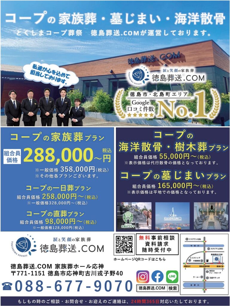 Life 家族葬の事なら 徳島葬送 徳島県内での家族葬のことなら コープ葬祭 徳島葬送.COM徳島葬送.COMは、徳島でのエンディングプランナーとして海洋散骨・墓じまい・遺品整理・終活や相続のご相談など幅広くワンストップサービスで承ります。 とくしま生協組合員特典コープの家族葬プラン組合員価格 ¥288,000~(税込)※通常価格¥358,000~(税込) コープの一日葬プラン組合員価格 ¥258,000~(税込)※通常価格¥328,000~(税込) コープの直葬プラン組合員価格 ¥98,000~(税込)※一般価格¥128,000円 ※家族葬事前相談・資料請求のお問合せ受け付けています。(組合員コードをお伝えください。)資料請求番号 156761 を注文書にご記入いただくと、ご自宅に資料がお届けできます。 お問い合わせは24時間365日対応専用ダイヤル:088-677-9070徳島葬送.comのHPは、下記URLをクリック http://tokushima-sousou.com 「とくしま生協×洋服の青山」 詳細は、下記広告よりご覧ください。↓とくしま生協フォーマルサポート広告 表とくしま生協フォーマルサポート広告 裏 ※洋服の青山「フォーマルサポートプラン」ご利用の際は、添付サポート広告の表・裏を印刷または、スマートフォンに画像を保存の上、ご来店いただけますようお願いいたします。 < 一覧へ戻る > 関連商品 葬祭 ベルべ玉鳳院 家族葬のことならベルべです とくしま生協組合員ならご葬儀費用が10%割引とさせていただきます。 家族葬の事なら 徳島葬送 徳島県内での家族葬のことならコープ葬祭 徳島葬送.COM ペット葬祭 まかせて安心! ペット葬の斡旋をしています! 仏壇・仏具・墓石 ぶつだんのもりでの墓石・石製品の購入に組合員割引が適応できます! 仏壇・仏具 森正(株)での仏壇・仏具の購入、仏壇のお洗濯に組合員特典があります! 葬祭 ベルモニー葬祭 徳島 とくしま生協オリジナルセット飛鳥/清風。ベルモニー会館会場使用料25%OFF! カテゴリ ALL 暮らす 遊ぶ 学ぶ PC/ネット 冠婚葬祭 車関連 ペット その他