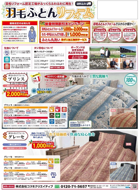 Life 羽毛ふとんのリフォーム・丸洗い 羽毛・羊毛・わた等・・・おふとんの打ち直しサービスを行っています。羽毛リフォーム認定工場がふっくらふわふわに再生!とくしま生協組合員向けに配布するチラシの内容に基づいてお申込み、またはお電話でお問合せ下さい。 その他のページは、スライダーでご確認ください。 提携先:コスモクリエイティブ チケットのお申し込み チケットのお申し込みに関しては、下記の専用ダイヤルにお電話ください。 088-698-0506 < 一覧へ戻る > 関連商品 シロアリのことならサニックス 外壁・屋根塗装 亀井ホーム お申込み・ご相談は、お気軽にご連絡下さい。 中古車購入応援 中古車専門店「WECARS」と提携。購入応援させていただきます。 アパマンショップ お部屋探しのアパマンショップ 葬祭 ベルべ玉鳳院 家族葬のことならベルべです とくしま生協組合員ならご葬儀費用が10%割引とさせていただきます。 ケントホームズ ピアノ調律・買取り・移動 徳島県内のピアノ調律を組合員特別価格で斡旋いたします! ウォーターサーバー (アクアクララ) 水の宅配便 “アクアクララ“ を斡旋しています! 家族葬の事なら 徳島葬送 徳島県内での家族葬のことならコープ葬祭 徳島葬送.COM コープの蓄電池🔆 始めませんか!電気の自給自足💥 「もしもの備え」と「電気代の節約」を考えませんか? メンズ・レディースファッション 組合員カードの提示で店頭価格からさらに10%割引! 大きなサイズの店「フォーエル」は5%割引! 車買取り 自動車を納得価格で買い取りいたします。 ふとん丸洗い宅配サービス フレスコウォッシングシステムは、水を浸み込ませることが難しい中わたの中心まで洗うために開発されたふとんの丸洗い方法です。 不用品回収・処分、生前・遺品整理、空家管理【まるや】 大切な思い出、真心を込めてお片付けいたします。 ソフトバンク 組合員とそのご家族は、3,000円相当還元! くらそうね 家屋の解体 「くらそうね」は解体工事の一括見積もりサービスです。 セコムホームセキュリティ 組合員の方には、お得な情報があります! 救命胴衣 津波が来た時に、何よりも大切な命を守るための “津波・水害対策用救命胴衣“ を宅配いたします。 彫刻(表札・ドックタグ・フォトフレーム・他) サンドブラスト工法でネームを彫刻した、表札、ドッグタグ、フォトフレーム/グラス/キーホルダー等のオリジナルギフトを組合員特別価格でお届けいたします! 年賀状・喪中ハガキ印刷 年賀状・喪中ハガキの印刷を宅配にて承っています。 相談(相続・遺言・後見・税) 相続問題なんて、ウチには関係ない・・・と思っていませんか??元気でないとできない準備があります。まずはお電話の上、相談にお越しください! 葬祭 ベルモニー葬祭 徳島 とくしま生協オリジナルセット飛鳥/清風。ベルモニー会館会場使用料25%OFF! 写真スタジオ 写真撮影と振袖レンタル(ジョイフル恵利)を組合員特別価格(通常価格の5%OFF)でご利用いただけます! 着物・レンタル衣装 振袖レンタルを組合員特別価格で提供しています!一般価格から5%OFF(特価格品は除く) リサイクル・リユース 送料0円 査定0円 簡単!便利!スピーディー!な宅配買取システム! ダンボールに詰めて送るだけ! 引越し 基本料金が通常価格の20%割引!お見積り特典:いわて純精米ひとめぼれプレゼント! 補聴器・マッサージチェア(フジ医療器) 試して実感! 補聴器を特別価格でご提供いたします! 羽毛ふとんのリフォーム・丸洗い 羽毛・羊毛・わた等・・・おふとんの打ち直しサービスを行っています。 JAF JAFの加入はネットからがお得! 合宿免許 全国60校の教習所の合宿免許をご紹介いたします! 自動車教習所 自動車運転免許の取得に組合員割引が適応できます! 浄水器(ゼンケン) ゼンケンの浄水器 “スーパー・アクアセンチュリー“ を月々:1,800円(税別)でレンタルしています。 自動車購入応援 自動車購入の際に購入資金援助を行います。 住宅(新築・リフォーム) 信頼できる提携業者を斡旋することにより、適正な価格で安心な施工をお約束いたします! パソコン・IT家電 トラブル解決 パソコン・スマホ・タブレット・IT家電・・・何でもサポート! お申込みはお電話で! ハウスクリーニング 信頼できる提携業者により適正価格で安心な施工をいたします! シロアリ駆除 「三共プロテック」 信頼できる提携業者を斡旋することにより、適正な価格で安心な施工をお約束いたします! カテゴリ ALL 暮らす 遊ぶ 学ぶ PC/ネット 冠婚葬祭 車関連 ペット その他