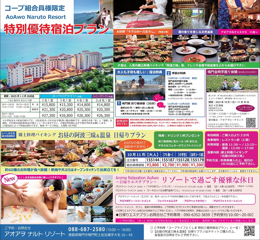 Life アオアヲナルトリゾートランチ券 とくしま生協組合員限定 郷土料理バイキングお昼の阿波三昧&温泉 日帰りプラン 10月・11月組合員特別価格(税・サービス料込)☆大人:3,800円☆シニア(75歳以上):2,700円☆小学生:1,900円☆幼児(3~5歳):1,300円※組合員特典:昼食時にドリンク1杯プレゼント! 生ビール1杯または、テラスカフェオーゲでソフトドリンク※ ランチ券有効期限:ご購入日より3か月※食事場所:レストラン彩(2階)※利用時間:昼食11:30~/13:15~ 温泉:12:00~17:00※食事内容:「郷土料理バイキング お昼の阿波三昧」※天然温泉:展望浴場(8階)・露天風呂(1階)注)ご利用日時により、浴場が変わる場合がございます。ご予約時にお問合せ下さい。※チケット購入の上、前日の18:00までにご予約下さい。<ご予約・お問合せ>TEL 088-687-2580(10:00~18:00) https://aoawo-naruto.com/ ※宿泊プランについては、アオアヲナルトリゾートまで、直接お申込み下さい。 (ご予約時は、「コープライフとくしま特別優待宿泊プラン」と一言お願いします)※日帰りエステプラン 「アロマ+食事+温泉」がセットになっています。注)エステプランは、お申し込み専用ダイヤルに ☎090-6352-3659 [予約受付/10:00~20:00]☆鳴門金時芋掘り体験 期間:2025年10月1日~11月30日 宿泊者以外のの方も利用可!お申し込みは、公式HPもしくはWEBすら予約いただけます。☆大人も子供も楽しい♪宿泊特典♪①鳴門鯛釣り堀体験(30分)②季節の特典 鳴門金時芋掘り体験(10月1日~11月30日 宿泊) 鳴門金時芋掘詰め放題(12月1日~12月26日 宿泊) チケットのお申し込み チケットのお申し込みに関しては、下記の専用ダイヤルにお電話ください。 088-698-0506 < 一覧へ戻る > 関連商品 アオアヲナルトリゾートランチ券 郷土料理バイキングお昼の阿波三昧&温泉 日帰りプラン NEWレオマワールド 入園券 22種のアトラクション、グルメにショッピング、1日では遊びきれない楽しさいっぱい! 淡路島海上ホテル 日帰り・宿泊プラン 春の訪れを目と舌とで同時に楽しむ"桜鯛"たっぷりと栄養を蓄えた絶品の桜鯛をご堪能ください。 JRホテルクレメント徳島 特別ランチ券 日本料理“藍彩”「藍彩遊山箱」組合員特別価格:3,000円(税・サービス料込) おもちゃ王国入園券 子どものワクワクするものをなんでも集めた「おもちゃ王国」でぜひお楽しみください♪ 竹野の海辺 湯やど 海の音~うみのね~ 兵庫県の名湯【城崎温泉】まで車で15分。温泉街をぶらり満喫した後は、さざ波の音に包まれる当館で癒しの一夜をお過ごしください。 鷲羽山ハイランド入園券 蒼い海と照りつける太陽の中に、響きわたるサンバのリズム♪ カテゴリ ALL 暮らす 遊ぶ 学ぶ PC/ネット 冠婚葬祭 車関連 ペット その他
